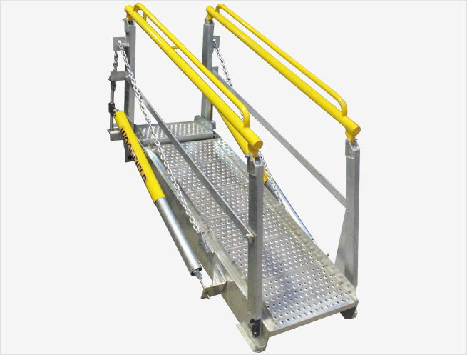 WG-96 Pasarela para acceso seguro a la parte superior de camiones cisterna, vagones o contenedores ISO. Disponible en aluminio, acero al carbono galvanizado o acero inoxidable. Hasta 144″ de longitud, resorte de tensión o funcionamiento neumático. Anchos disponibles de 600mm a 1830mm. Equipado con pasarela no deslizante, rieles de mano, barras de rodilla y pie. Diseño con soporte o auto-soporte. Modelos con desplazamiento lateral también disponibles.