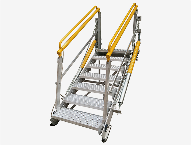 FS-6 Escaleras plegables. Para un acceso seguro a la parte superior de los camiones cisterna, vagones o contenedores ISO. Disponible en aluminio, acero al carbono galvanizado o acero inoxidable. De 3 a 11 escalones, resorte de tensión o funcionamiento neumático. Anchos disponibles de 600mm a 1830mm. Equipado con escalones dentados no deslizantes, rieles de manos, rodillas y pies. Diseño con soporte o auto-soporte. Modelos con desplazamiento horizontal también disponible.